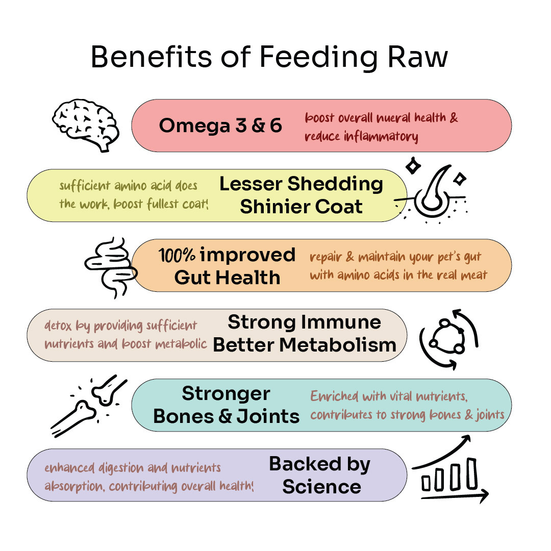 Increased energy and vitality: Some pet owners report that their animals have more energy and are generally more active on raw diets. Enhanced digestion: Study shows natural amino acid in raw is more easy to absorb and digest.