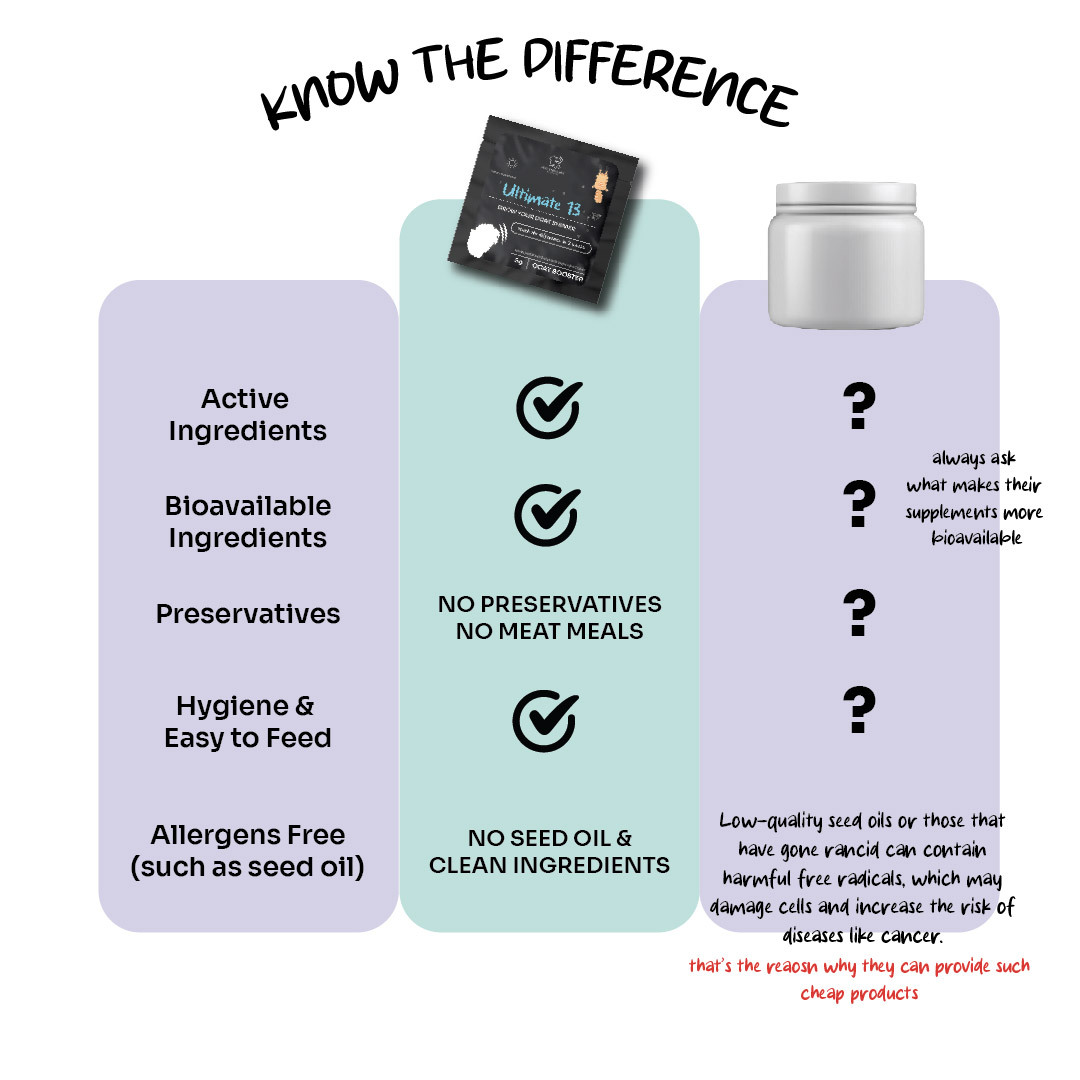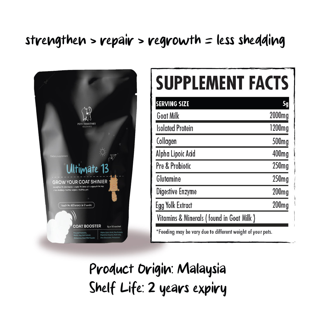 With ingredients like biotin, collagen, probiotics, and alpha lipoic acid, Ultimate 13 ensures your cat receives the nutrients needed to maintain a luxurious coat while supporting overall health.