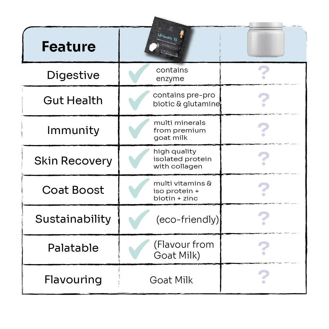 Ingredients: Pre & probiotic, digestive enzyme, minerals, l-glutamine, goat milk powder, zinc gluconate, alpha lipoic acid, isolated protein, collagen, potassium, biotin, egg yolk extract.