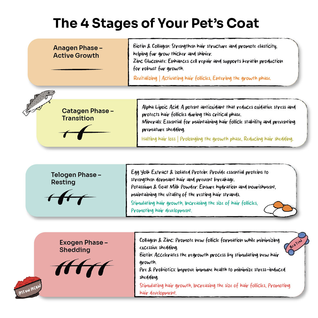 A cat's fur goes through a natural growth cycle with four key stages: Anagen, Catagen, Telogen, and Exogen. Each phase represents a unique process in the lifecycle of the hair follicle, which directly impacts the health, thickness, and shine of a cat's coat. Ultimate 13, with its powerful combination of 13 carefully selected ingredients, works synergistically to support each stage of this cycle for optimal coat health.